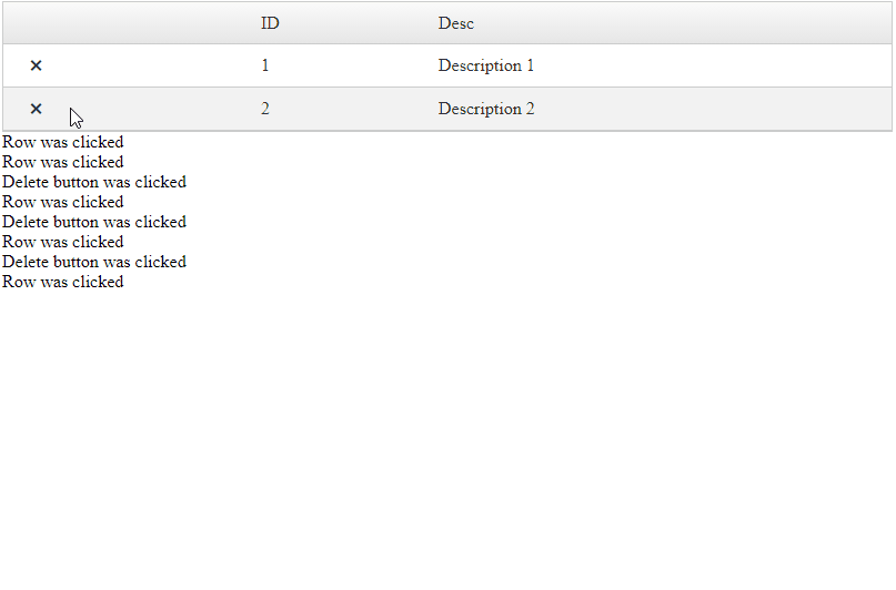 One solution I am trying is to use the column mouse over client side event to set a variable showing what column the mouse is over when the client side row click happens. If it is over the Delete column then it cancels the ajax request. But there is some issues I'm working on for this.