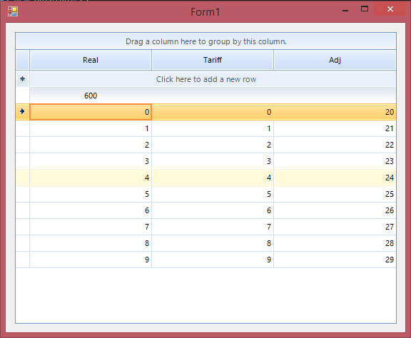 Dim real As GridViewSummaryItem = New GridViewSummaryItem("Real", "{0:#,##;(#,##);#}", "IIf(Sum(Tariff) = 0, 0, ((Sum(Tariff) + Sum(Adj)) / (Sum(Tariff) + 0.000000001))) * 100")Please note I have also tried handling GroupSummaryEvaluate and testing for zero, but for this specific scenario, I need the exact formula I am using to be in a single GridViewSummaryItem as I call summaryItem.GetSummaryExpression() elsewhere in my code (I have implemented my own GridGroupContentCellElement to have aggregate values in the group rows) and need the full formula to be returned.
