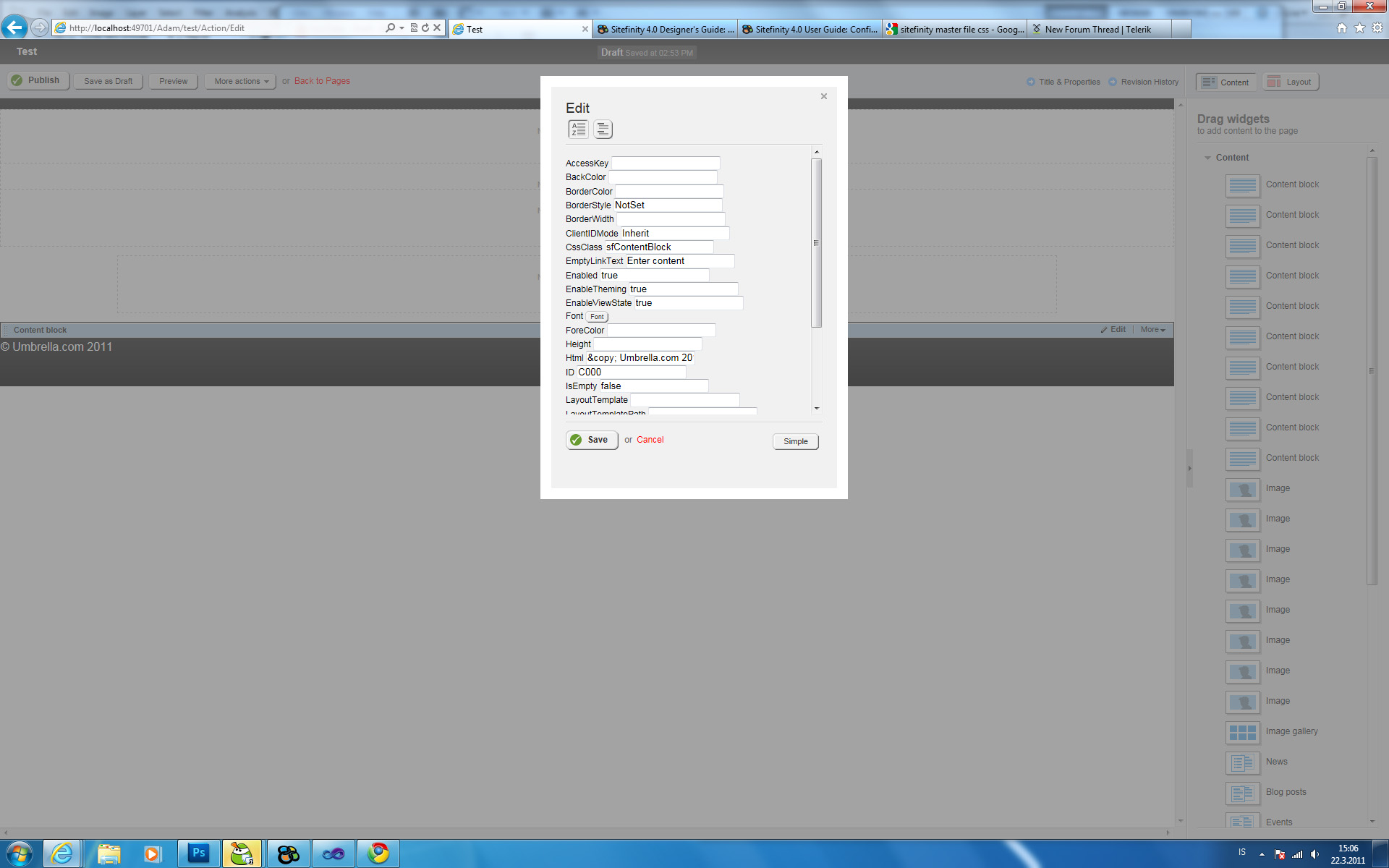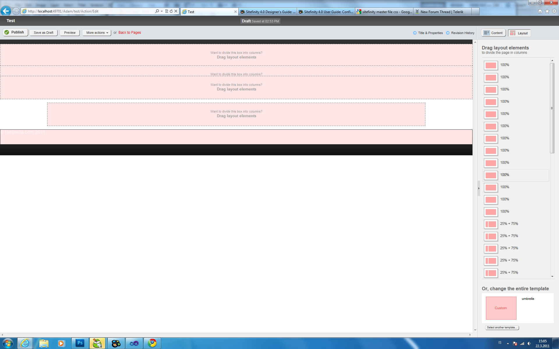 Hello, I've encountered a problem when I am trying to use a custom .master file, when I set a page to use the master file and I get into the whole editing zone, the drag and drop fields and such. If I want to drag over lets say, a content block: I get duplicated blocks, like each click I get the selected item duplicated and can't drag the "top" element, but only the duplicated ones onto the custom master "design".