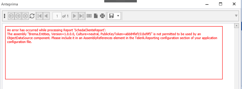 <configuration> <configSections> <section name="Telerik.Reporting" type="Telerik.Reporting.Configuration.ReportingConfigurationSection, Telerik.Reporting" allowLocation="true" allowDefinition="Everywhere" /> </configSections> <runtime> <assemblyBinding xmlns="urn:schemas-microsoft-com:asm.v1"> <dependentAssembly> <assemblyIdentity name="System.Runtime" publicKeyToken="b03f5f7f11d50a3a" culture="neutral" /> <bindingRedirect oldVersion="0.0.0.0-2.6.10.0" newVersion="2.6.10.0" /> </dependentAssembly> <dependentAssembly> <assemblyIdentity name="System.Threading.Tasks" publicKeyToken="b03f5f7f11d50a3a" culture="neutral" /> <bindingRedirect oldVersion="0.0.0.0-2.6.10.0" newVersion="2.6.10.0" /> </dependentAssembly> </assemblyBinding> </runtime> <Telerik.Reporting> <assemblyReferences> <add name="Brema.Entities" version="1.0.0.0" culture="neutral" publicKeyToken="null"/> </assemblyReferences> </Telerik.Reporting> </configuration>8 Answers, 1 is accepted