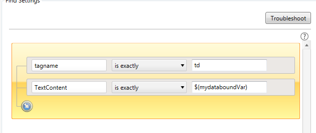 I have successfully managed to extract data from an element into a DataBindVariable and have also managed to then use that data later in the test by placing it into a text box. I now need to verify that the same data is found in a tablecell within a radgrid that I have on screen and then subsequently double-click on the item. My issue is that I seem unable to locate the tablecell item by referencing the databoundvariable. I have tried editing the element and changing the find settings TextContent tag to look for $(mydataboundvar) but to no avail. What am I missing here? Any advice appreciated. See attached screen shot for what I have tried, but does not work as expected.