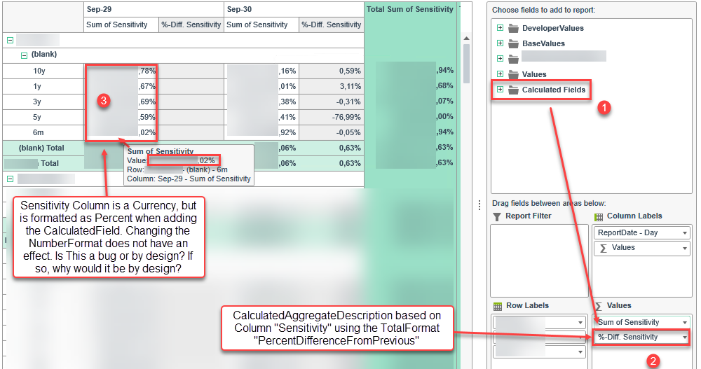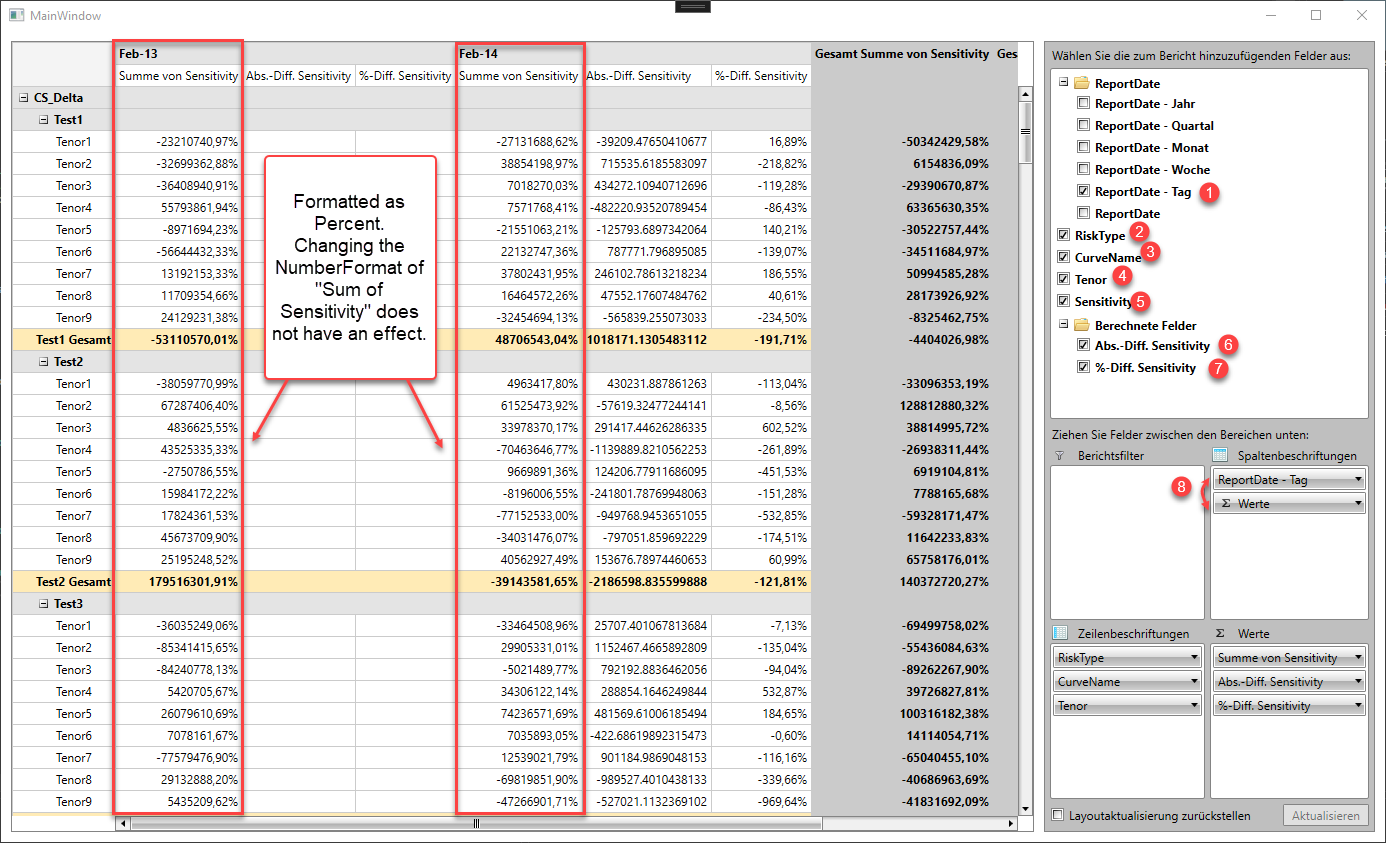 I´ve attached a screenshot of a behaviour within the PivotGrid I do not understand. When adding a calculated field making use of the TotalFormat "PercentDifferenceFromPrevious", the underlying column used for the calculation is formatted as percentage value? How can I overcome this issue? Changing the NumberFormat within the PropertyAggregateDescription for "Sum of Sensitivity" does not have an effect.