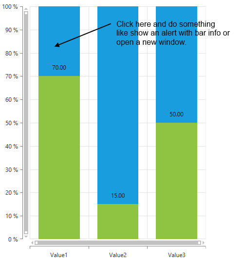 <telerik:RadCartesianChart Name="CartesianChartDemo" Margin="10"> <telerik:RadCartesianChart.Behaviors> <telerik:ChartPanAndZoomBehavior PanMode="Both" ZoomMode="Both"/> </telerik:RadCartesianChart.Behaviors> </telerik:RadCartesianChart>CartesianChartDemo.VerticalAxis = new LinearAxis();CartesianChartDemo.HorizontalAxis = new CategoricalAxis();CartesianChartDemo.Grid = new CartesianChartGrid() { MajorLinesVisibility = GridLineVisibility.XY };DataTable dtAlloys = new DataTable("DATA");dtAlloys.Columns.Add(new DataColumn("Name", typeof(string)));dtAlloys.Columns.Add(new DataColumn("Value1", typeof(double)));dtAlloys.Columns.Add(new DataColumn("Value2", typeof(double)));dtAlloys.Rows.Add(new object[] { "Value1", 70, 30 });dtAlloys.Rows.Add(new object[] { "Value2", 15, 85 });dtAlloys.Rows.Add(new object[] { "Value3", 50, 50 });BarSeries barSer = new BarSeries();barSer.ShowLabels = true;barSer.CombineMode = ChartSeriesCombineMode.Stack100;BarSeries barSer2 = new BarSeries();barSer2.ShowLabels = true;barSer2.CombineMode = ChartSeriesCombineMode.Stack100;foreach (DataRow drAlloy in dtAlloys.Rows){ barSer.DataPoints.Add(new CategoricalDataPoint() { Category = drAlloy["Name"], Label = string.Format("{0:N}", drAlloy["Value1"]), Value = double.Parse(drAlloy["Value1"].ToString()) }); barSer2.DataPoints.Add(new CategoricalDataPoint() { Category = drAlloy["Name"], Label = string.Format("{0:N}", drAlloy["Value2"]), Value = double.Parse(drAlloy["Value2"].ToString()) }); }CartesianChartDemo.Series.Clear();CartesianChartDemo.Series.Add(barSer);CartesianChartDemo.Series.Add(barSer2);I am trying to use the MouseDown event to do something like show an alert with bar info or open a new window and pass it data from that bar that I am clicking.