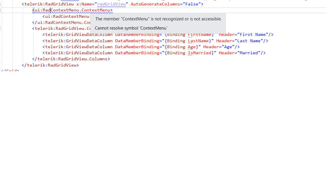 I want to add context menu for RadGridView and tried below code.. but it gives error as in the attached screenshot. please let me know how to proceed.