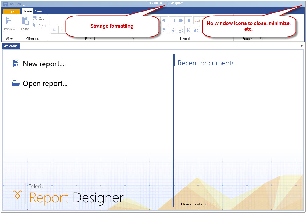 Just thought I would share a quick observation when running the report designer in Windows 8. See the screen capture attached below. The window icons for closing, minimizing, etc. are not visible. I am sure you guys are working on these sort of things. Thanks!