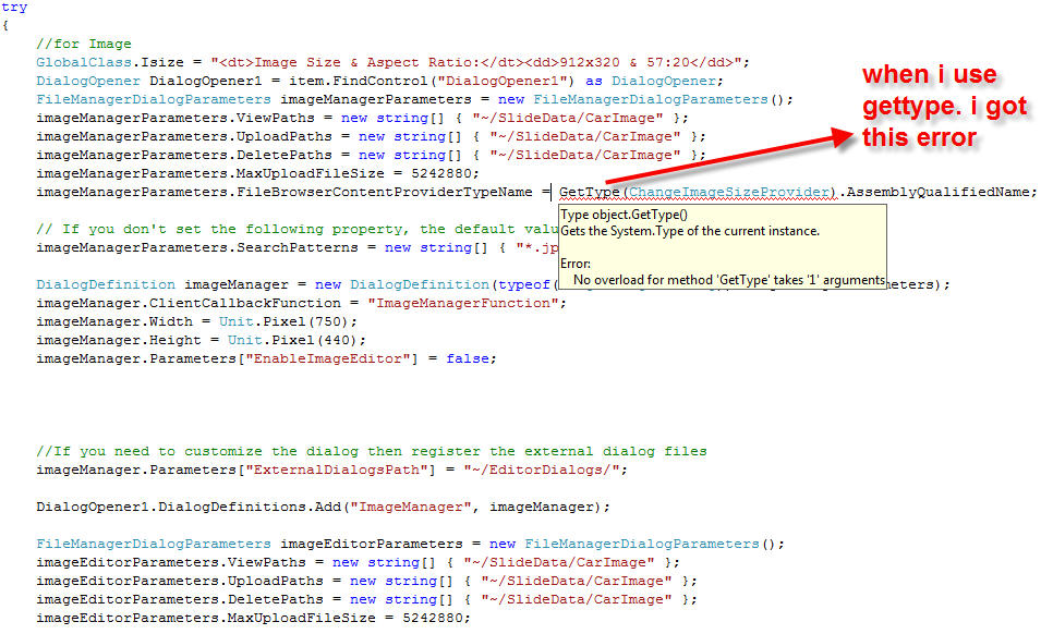 RadEditor1.ImageManager.ContentProviderTypeName = "ContentProviders.RadEditor.MyContentProvider, App_Code" to my code behind, the Image Manager page has the following error: