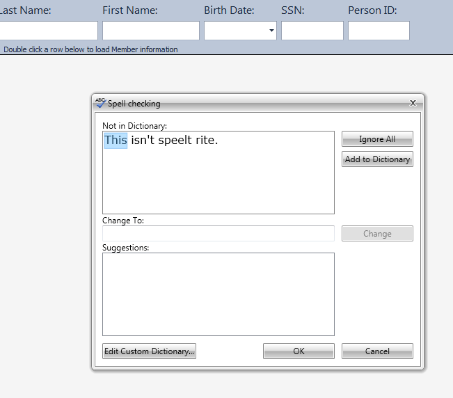 This almost works, I get the SpellCheck window with my text in it but there aren't any words in the dictionary. Because of the way I'm doing it would I need to add the base English Dictionary back in? Am I making some other rookie mistake? Attached is an image of what I am seeing and below is the simple code snippet in it's entirety.
