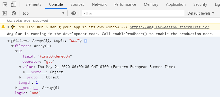 and inspect the browser console after filtering per the "FirstOrderedOn" column: