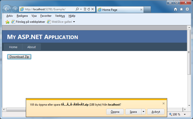 Could you please try the example on different browser than IE, for example Firefox or Chrome. I assume that the IE does not have installed any language packs and that’s way the file name has encoding problems. Also in order to works as expected you need to install Swedish language pack for IE. You can download it from here: