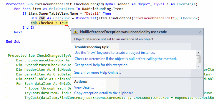 Protected Sub cbxEncumbranceEdit_CheckedChanged(ByVal sender As Object, ByVal e As EventArgs) Dim cbxEncumbranceEdit As CheckBox = DirectCast(sender, CheckBox) Dim item As GridEditFormItem = DirectCast(cbxEncumbranceEdit.NamingContainer, GridEditFormItem) Dim cbxExpendituresEdit As CheckBox = DirectCast(item.FindControl("cbxExpendituresEdit"), CheckBox) 'cbxExpendituresEdit.Enabled = Not cbxEncumbranceEdit.Checked cbxExpendituresEdit.Checked = True cbxEncumbranceEdit.Checked = False End Sube.Exception = {"Cannot insert the value NULL into column 'Encumbrance', table 'PurchaseOrder'; column does not allow nulls. UPDATE fails. The statement has been terminated."}