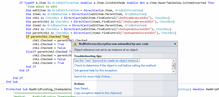 If TypeOf e.Item Is GridEditFormItem AndAlso e.Item.IsInEditMode AndAlso Not e.Item.OwnerTableView.IsItemInserted Then 'item about to edit Dim editItem As GridEditFormItem = DirectCast(e.Item, GridEditFormItem) Dim chk1 As CheckBox = DirectCast(editItem.FindControl("cbxEncumbranceEdit"), CheckBox) Dim chk2 As CheckBox = DirectCast(editItem.FindControl("cbxExpendituresEdit"), CheckBox) If chk1.Checked Then chk1.Checked = True chk2.Checked = False ElseIf chk2.Checked Then chk1.Checked = False chk2.Checked = True End If End Ifmy error still: e.Exception = {"Cannot insert the value NULL into column ...."}