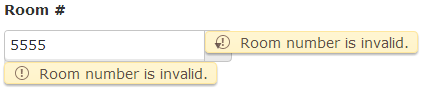 $(".entryform").kendoValidator({ rules: { invalidRoom: function (input) { if(input.is("[name=Room]")) { if (input.val()!= "" && $("#Room").data("kendoComboBox").selectedIndex == -1) { return false; } return true; } } }, messages: { invalidRoom: "Room number is invalid." }Is this the right way? Actual hiccup now is the validation message appears at two places. See the attached image.