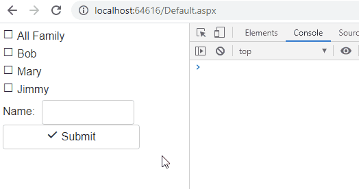 <div style="float: left; width: 100%;"> <telerik:RadCheckBoxList runat="server" ID="RadCheckBoxListMembers" AutoPostBack="false" RenderMode="Lightweight" ClientIDMode="Static"> <ClientEvents OnItemCheckedChanged="OnItemCheckedChanged" OnLoad="function(sender) { radCheckBoxList = sender; }" /> <Items> <telerik:ButtonListItem Text="All Family" Value="-1" /> <telerik:ButtonListItem Text="Bob" Value="0" /> <telerik:ButtonListItem Text="Mary" Value="1" /> <telerik:ButtonListItem Text="Jimmy" Value="2" /> </Items> </telerik:RadCheckBoxList> <asp:RequiredFieldValidator runat="server" ErrorMessage="Please select a member(s)" ValidationGroup="ValidationGroup" Display="None" ControlToValidate="RadCheckBoxListMembers" EnableClientScript="true" /></div> <div style="float: left; width: 100%;"> <telerik:RadTextBox runat="server" ID="RadTextBoxName" Label="Name:" /> <asp:RequiredFieldValidator runat="server" ErrorMessage="Please enter a name" ValidationGroup="ValidationGroup" Display="None" ControlToValidate="RadTextBoxName" EnableClientScript="true" /></div><div style="float: left; width: 100%;"> <telerik:RadButton runat="server" ID="RadButtonSubmit" CausesValidation="true" ValidationGroup="ValidationGroup" Text="Submit" RenderMode="Lightweight" AutoPostBack="true" Width="200px" Enabled="true" OnClick="RadButtonSubmit_Click"> <Icon PrimaryIconCssClass="rbOk" /> </telerik:RadButton></div> <div style="float: left; width: 100%;"> <asp:ValidationSummary runat="server" ValidationGroup="ValidationGroup" /></div><telerik:RadScriptBlock ID="RadScriptBlock1" runat="server"> <script type="text/javascript"> //![CDATA[ var radCheckBoxList; function OnItemCheckedChanged(sender, args) { alert(radCheckBoxList.get_selectedIndex()); }//]]> </script></telerik:RadScriptBlock>