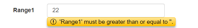 The problematic code being: data-val-range="'Range1' must be greater than or equal to ''." data-val-range-max="" data-val-range-min=""
