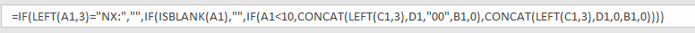 =IF(LEFT(A1,3)="NX:","",IF(ISBLANK(A1),"",IF(A1<10,CONCAT(LEFT(C1,3),D1,"00",B1,0),CONCAT(LEFT(C1,3),D1,0,B1,0))))