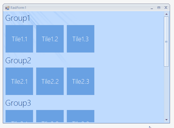 Imports Telerik.WinControlsImports Telerik.WinControls.LayoutsImports Telerik.WinControls.UIClass CustomPanorama Inherits RadPanorama Private vScroll As RadScrollBarElement Protected Overrides Sub CreateChildItems(ByVal parent As Telerik.WinControls.RadElement) MyBase.CreateChildItems(parent) Me.vScroll = New RadScrollBarElement() Me.vScroll.ScrollType = ScrollType.Vertical Me.vScroll.StretchHorizontally = False Me.vScroll.StretchVertically = True Me.vScroll.MinSize = New System.Drawing.Size(16, 0) Me.vScroll.Alignment = System.Drawing.ContentAlignment.TopRight Me.PanoramaElement.Children.Add(vScroll) AddHandler vScroll.ValueChanged, AddressOf vScroll_ValueChanged AddHandler PanoramaElement.GroupLayout.RadPropertyChanged, AddressOf GroupLayout_RadPropertyChanged AddHandler PanoramaElement.TileLayout.RadPropertyChanged, AddressOf GroupLayout_RadPropertyChanged Me.ScrollBarAlignment = HorizontalScrollAlignment.Bottom End Sub Private Sub GroupLayout_RadPropertyChanged(ByVal sender As Object, ByVal e As Telerik.WinControls.RadPropertyChangedEventArgs) If e.Equals(RadElement.BoundsProperty) AndAlso sender = Me.GetCurrentLayout() Then UpdateVScroll() End If End Sub Protected Overrides Sub OnSizeChanged(ByVal e As EventArgs) MyBase.OnSizeChanged(e) UpdateVScroll() End Sub Private Sub UpdateVScroll() vScroll.Maximum = Me.GetCurrentLayout().Size.Height vScroll.LargeChange = Math.Max(0, CInt((Me.Size.Height - Me.PanoramaElement.ScrollBar.Size.Height))) If vScroll.LargeChange >= vScroll.Maximum Then vScroll.Visibility = ElementVisibility.Hidden Else vScroll.Visibility = ElementVisibility.Visible End If If Me.PanoramaElement.ScrollBar.Visibility = ElementVisibility.Visible Then vScroll.Margin = New System.Windows.Forms.Padding(0, 0, 0, Me.PanoramaElement.ScrollBar.Size.Height) Else vScroll.Margin = New System.Windows.Forms.Padding(0) End If End Sub Private Sub vScroll_ValueChanged(ByVal sender As Object, ByVal e As EventArgs) Me.GetCurrentLayout().PositionOffset = New System.Drawing.SizeF(0, -Me.vScroll.Value) End Sub Private Function GetCurrentLayout() As LayoutPanel If Me.ShowGroups Then Return Me.PanoramaElement.GroupLayout End If Return Me.PanoramaElement.TileLayout End Function Public Overrides Property ThemeClassName As String Get Return GetType(RadPanorama).FullName End Get Set(ByVal value As String) MyBase.ThemeClassName = value End Set End PropertyEnd Class