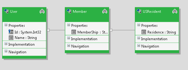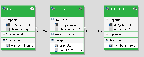 The User table has an identity (int) primary key. The Member table has an int (non-identity) primary key which matches 1 row in User (although there will be rows in User which are not Members, so the association will be User(1) - Member(0..1). A USResident will also have an int (non-identity) primary key which matches 1 row in both Member and User (although there will be rows in Member which are not USResidents, so the association will be Member(1) - USResident(0..1). Ultimately, the Id (primary key) columns should be removed from the model for both Member and USResident - since they will be inherited from User.