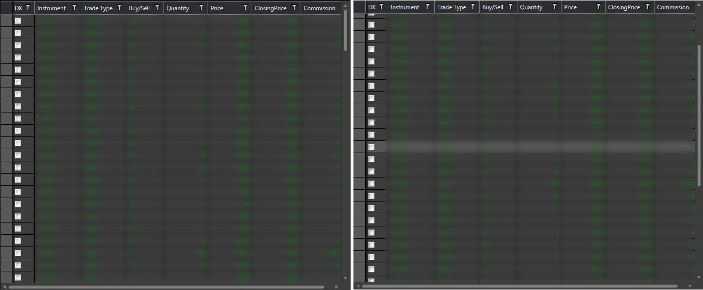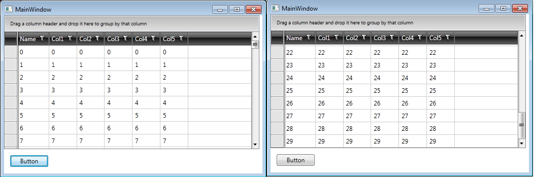 <Window x:Class="telerik.MainWindow" Title="MainWindow" Height="350" Width="525" xmlns:telerik="http://schemas.telerik.com/2008/xaml/presentation"> <Grid> <telerik:RadGridView HorizontalAlignment="Left" Name="rgv" VerticalAlignment="Top" Height="264" Width="503" /> <Button Content="Button" Height="23" HorizontalAlignment="Left" Margin="12,276,0,0" Name="button1" VerticalAlignment="Top" Width="75" Click="button1_Click" /> </Grid></Window>using System;using System.Collections.Generic;using System.Linq;using System.Text;using System.Windows;using System.Windows.Controls;using System.Windows.Data;using System.Windows.Documents;using System.Windows.Input;using System.Windows.Media;using System.Windows.Media.Imaging;using System.Windows.Navigation;using System.Windows.Shapes;using System.ComponentModel;using System.Collections.ObjectModel;namespace telerik{ public partial class MainWindow : Window { public ObservableCollection<TestData> test = new ObservableCollection<TestData>(); public MainWindow() { InitializeComponent(); rgv.ItemsSource = test; } private void button1_Click(object sender, RoutedEventArgs e) { for (int i = 0; i < 30; i++) { test.Add(new TestData{ Col1 = i, Col2 = i, Col3 = i, Col4 = i, Col5 = i, Name = i.ToString()}); } } } public class TestData : INotifyPropertyChanged { private string _name; private int _col1; private int _col2; private int _col3; private int _col4; private int _col5; public string Name { get { return _name; } set { if (value == _name) return; _name = value; OnPropertyChanged("Name"); } } public int Col1 { get { return _col1; } set { if (value == _col1) return; _col1 = value; OnPropertyChanged("Col1"); } } public int Col2 { get { return _col2; } set { if (value == _col2) return; _col2 = value; OnPropertyChanged("Col2"); } } public int Col3 { get { return _col3; } set { if (value == _col3) return; _col3 = value; OnPropertyChanged("Col3"); } } public int Col4 { get { return _col4; } set { if (value == _col4) return; _col4 = value; OnPropertyChanged("Col4"); } } public int Col5 { get { return _col5; } set { if (value == _col5) return; _col5 = value; OnPropertyChanged("Col5"); } } private event PropertyChangedEventHandler propertyChanged; public event PropertyChangedEventHandler PropertyChanged { add { if (propertyChanged == null || !propertyChanged.GetInvocationList().Contains(value)) { propertyChanged += value; } } remove { propertyChanged -= value; } } protected virtual void OnPropertyChanged(string propertyName) { PropertyChangedEventHandler handler = this.propertyChanged; if (handler != null) { var e = new PropertyChangedEventArgs(propertyName); handler(this, e); } } }}I attached a screenshot showing the problem again.