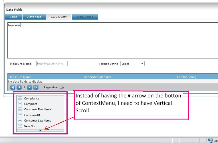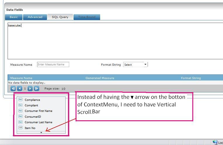 In RadContextMenu, these ^ v icons will use for go down or go up. here i would like to have a vertical scroll bar.