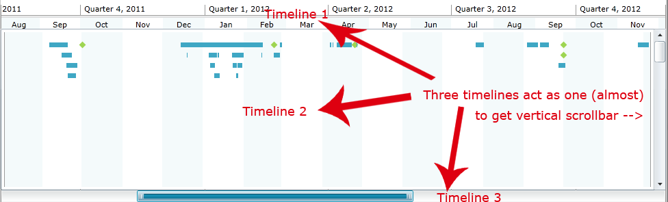 I have the middle timeline surrounded by a scroll viewer with the top and bottom timelines only showing the top and bottom of the control with negative margins and specific heights so all three controls look like one control... I get the vertical scroll bar and with all three timelines on the same binding I can get them to sync with the VisiblePeriodChanged event, but unfortunately there is no VisiblePeriodCHANGING event so it doesn't look like the normal timeline that changes as you adjust the bottom bar - the items and date label only change after you have adjusted the bottom scrollbar.