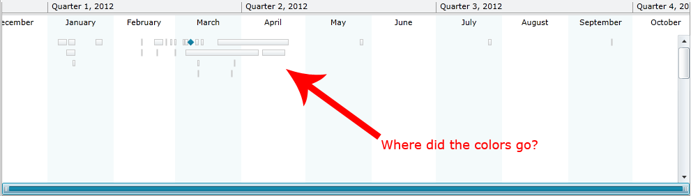 Now, getting back to the custom theme - when I tested the approach on my end, I was able to create a custom theme for the timeline with no problems. That is why, I cannot be sure what could be causing the colors to disappear from the timeline. Basically, as you are using the 2012.1 326 version and the XAML for the 2012.1 326 you should not have the described problems, in case you simply added a scrollViewer to the timeline template. I have seen the problem with the converter in some cases, but in case you use the XAML namespaces from the XAML file as they are, you should not have problems with the converter. In case you continue to have problems with this, please open a formal support ticket and send us the custom theme. - Thank you for the note about the help topic. Basically, you do not need the CustomItemTemplateSelector property of the viewmodel at all - we will remove this from the topic. You can simply set the ItemTemplateSelector property of the timeline to: