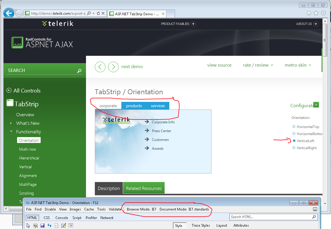 In IE7, open http://demos.telerik.com/aspnet-ajax/tabstrip/examples/functionality/orientation/defaultcs.aspx then select the VerticalLeftOrientation. You will get a HorizontalTop orientation instead. See attached screen shot.