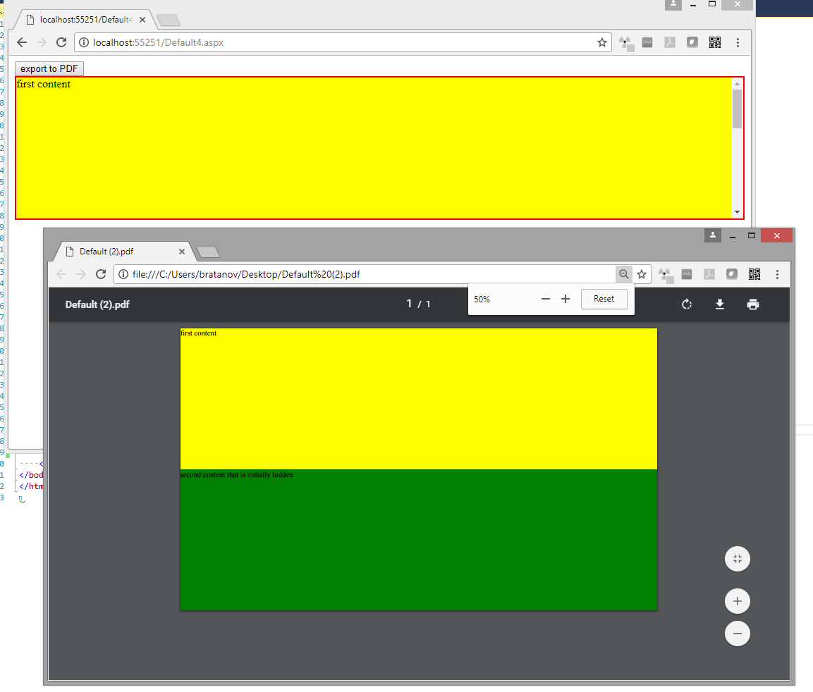 <style> #content { height: 200px; border: 2px solid red; overflow: auto; } #content.k-pdf-export { height: auto; overflow: initial; }</style><telerik:RadClientExportManager runat="server" ID="rcem1"></telerik:RadClientExportManager><asp:Button Text="export to PDF" OnClientClick="getPdf(); return false;" runat="server" /><script> function getPdf() { $find("<%=rcem1.ClientID%>").exportPDF($telerik.$("#content")); }</script><div id="content"> <div style="height: 300px; background: yellow;">first content</div> <div style="height: 300px; background: green;">second content that is initially hidden</div></div>Regards, Marin Bratanov