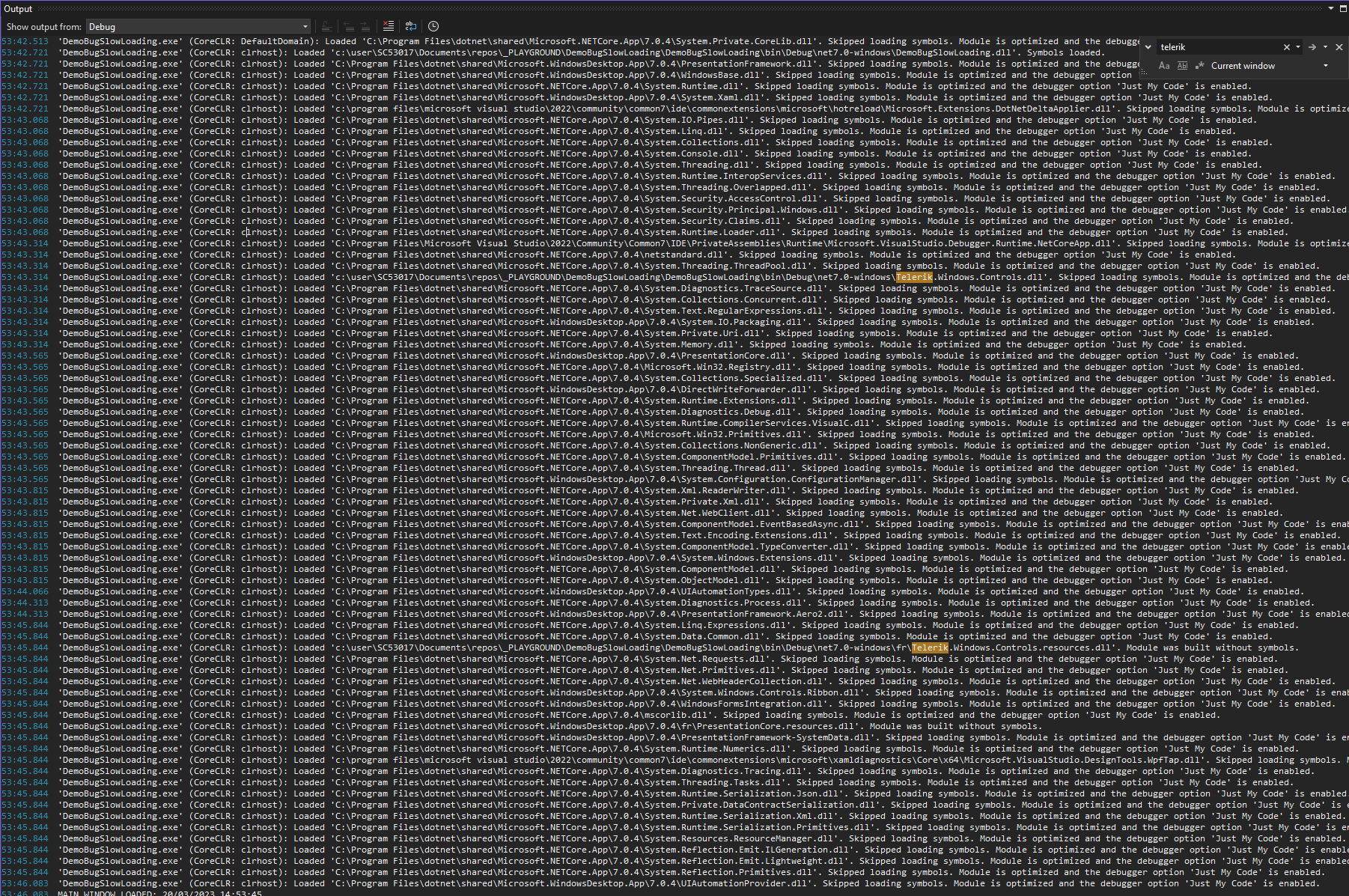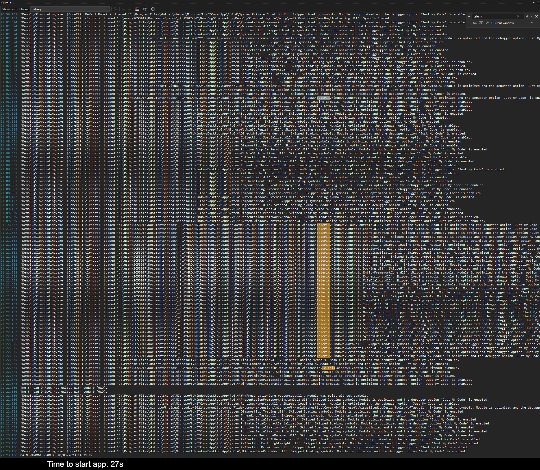In the screenshot "telerik_debug_logs.png", we can see that the app decides to load 30+ Telerik DLLs, almost none of which are necessary for this tiny app. Loading all these DLLs takes time, most notably the first one (Telerik.Window.Controls.dll) which seems to take 5.9 seconds on it's own.