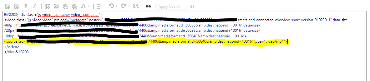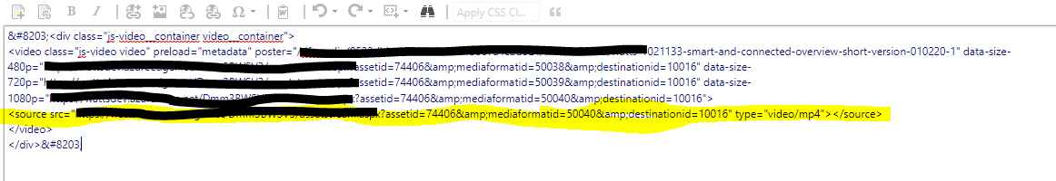 RadEditor is closing the source element that is nested inside the video element . For example, in the attached screen shots show the “source” element which we add it to Rich text field. After we save the Rich Text field and open it again, we see the source element is closed. Is there a configuration setting that would allow us to bypass the closure of the source element?