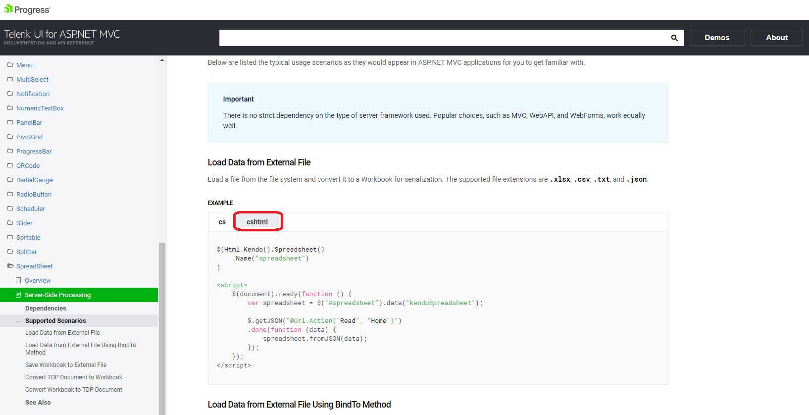 public class HomeController : Controller{ public ActionResult Read() { var path = Server.MapPath("~/App_Data/path/to/document.xlsx"); var workbook = Telerik.Web.Spreadsheet.Workbook.Load(path); //Uses Newtonsoft.Json internally to serialize fields correctly. return Content(workbook.ToJson(), Telerik.Web.Spreadsheet.MimeTypes.JSON); }}