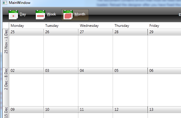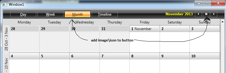public class ViewModeContentTemplateSelector : DataTemplateSelector{ public DataTemplate DayViewModeButtonContentTemplate { get; set; } public DataTemplate WeekViewModeButtonContentTemplate { get; set; } public DataTemplate MonthViewModeButtonContentTemplate { get; set; } public DataTemplate TimelineViewModeButtonContentTemplate { get; set; } public override DataTemplate SelectTemplate(object item, DependencyObject container) { if (item is WeekViewDefinition) { return this.WeekViewModeButtonContentTemplate; } else if (item is DayViewDefinition) { return this.DayViewModeButtonContentTemplate; } else if (item is MonthViewDefinition) { return this.MonthViewModeButtonContentTemplate; } else if (item is TimelineViewDefinition) { return this.TimelineViewModeButtonContentTemplate; } return base.SelectTemplate(item, container); }}Please give it a try and let me know if it works for you. However you may also need to replace the ControlTemplates in my project with the ControlTemplates from your version of the controls as there may be differences which can break the project.
