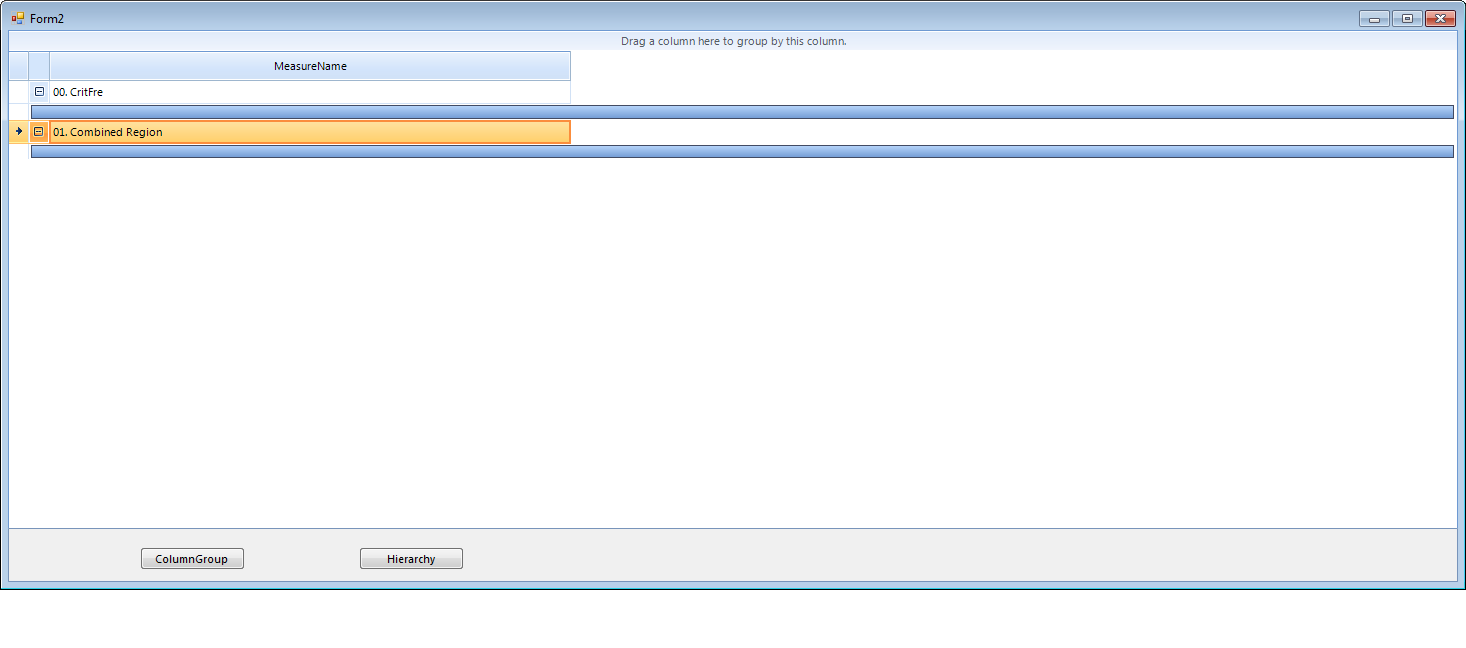 using System; using System.Collections.Generic; using System.ComponentModel; using System.Data; using System.Drawing; using System.Linq; using System.Text; using System.Windows.Forms; using Telerik.WinControls; using Telerik.WinControls.UI; using Telerik.WinControls.RadControlSpy; namespace RadGridView_hierarchy_C { public partial class Form1 : Form { public Form1() { InitializeComponent(); this.Load += new System.EventHandler(this.Form1_Load); } private void Form1_Load(object sender, EventArgs e) { creatingHierarchicalGridInUnboundMode(); } public void creatingHierarchicalGridInUnboundMode() { DataTable parentData = new DataTable("MonitoringSymbolsParents"); parentData.Columns.Add("ID", typeof(int)); parentData.Columns.Add("Symbol", typeof(string)); parentData.Columns.Add("Start Time", typeof(string)); parentData.Columns.Add("End Time", typeof(string)); parentData.Columns.Add("Depth", typeof(int)); parentData.Columns.Add("Min Bid", typeof(string)); parentData.Columns.Add("Max Bid", typeof(string)); DataTable childData = new DataTable("MonitoringSymbolsChildren"); childData.Columns.Add("ID", typeof(int)); childData.Columns.Add("ParentID", typeof(int)); childData.Columns.Add("Symbol", typeof(string)); childData.Columns.Add("Start Time", typeof(string)); childData.Columns.Add("End Time", typeof(string)); childData.Columns.Add("Depth", typeof(int)); childData.Columns.Add("Min Bid", typeof(string)); childData.Columns.Add("Max Bid", typeof(string)); this.radGridView1.DataSource = parentData; GridViewTemplate template = new GridViewTemplate(); template.DataSource = childData; radGridView1.MasterTemplate.Templates.Add(template); GridViewRelation relation = new GridViewRelation(radGridView1.MasterTemplate); relation.ChildTemplate = template; relation.RelationName = "MyRelation"; relation.ParentColumnNames.Add("ID"); relation.ChildColumnNames.Add("ParentID"); radGridView1.Relations.Add(relation); // parent data parentData.Rows.Add(1, "AUD/CAD Parent", "12/20/2010 12:28:15 PM", "12/20/2010 3:28:15 PM", 1, "1.0098", "1.01261"); parentData.Rows.Add(2, "AUD/CCC Parent", "12/20/2010 12:28:15 PM", "12/20/2010 3:28:15 PM", 2, "1.00978", "1.01258"); parentData.Rows.Add(3, "AUD/DDD Parent", "12/20/2010 12:28:15 PM", "12/20/2010 3:28:15 PM", 3, "1.00961", "1.01258"); // child data childData.Rows.Add(1, 1, "AUD/CAD Child", "12/20/2010 12:28:15 PM", "12/20/2010 3:28:15 PM", 1, "1.0098", "1.01261"); childData.Rows.Add(2, 1, "AUD/CAD Child", "12/20/2010 12:28:15 PM", "12/20/2010 3:28:15 PM", 2, "1.00978", "1.01258"); childData.Rows.Add(3, 1, "AUD/CAD Child", "12/20/2010 12:28:15 PM", "12/20/2010 3:28:15 PM", 3, "1.00961", "1.01258"); this.radGridView1.MasterTemplate.Columns["ID"].IsVisible = true; this.radGridView1.Templates[0].Columns["ID"].IsVisible = true; this.radGridView1.Templates[0].Columns["ParentID"].IsVisible = true; this.radGridView1.Templates[0].ShowColumnHeaders = true; this.radGridView1.MasterTemplate.AutoSizeColumnsMode = GridViewAutoSizeColumnsMode.Fill; this.radGridView1.Templates[0].AutoSizeColumnsMode = GridViewAutoSizeColumnsMode.Fill; // Set all column widths foreach (GridViewColumn parentColumn in this.radGridView1.MasterTemplate.Columns) { if (parentColumn.IsVisible) { parentColumn.Width = 50; parentColumn.MinWidth = 50; } } foreach (GridViewColumn childColumn in this.radGridView1.Templates[0].Columns) { if (childColumn.IsVisible) { childColumn.Width = 50; childColumn.MinWidth = 50; } } ColumnGroupsViewDefinition view = new ColumnGroupsViewDefinition(); view.ColumnGroups.Add(new GridViewColumnGroup("Bids")); view.ColumnGroups[0].Rows.Add(new GridViewColumnGroupRow()); view.ColumnGroups[0].Rows[0].Columns.Add(this.radGridView1.Templates[0].Columns["Min Bid"]); // must define as the child template column. view.ColumnGroups[0].Rows[0].Columns.Add(this.radGridView1.Templates[0].Columns["Max Bid"]); this.radGridView1.Templates[0].ViewDefinition = view; } } }Note this line