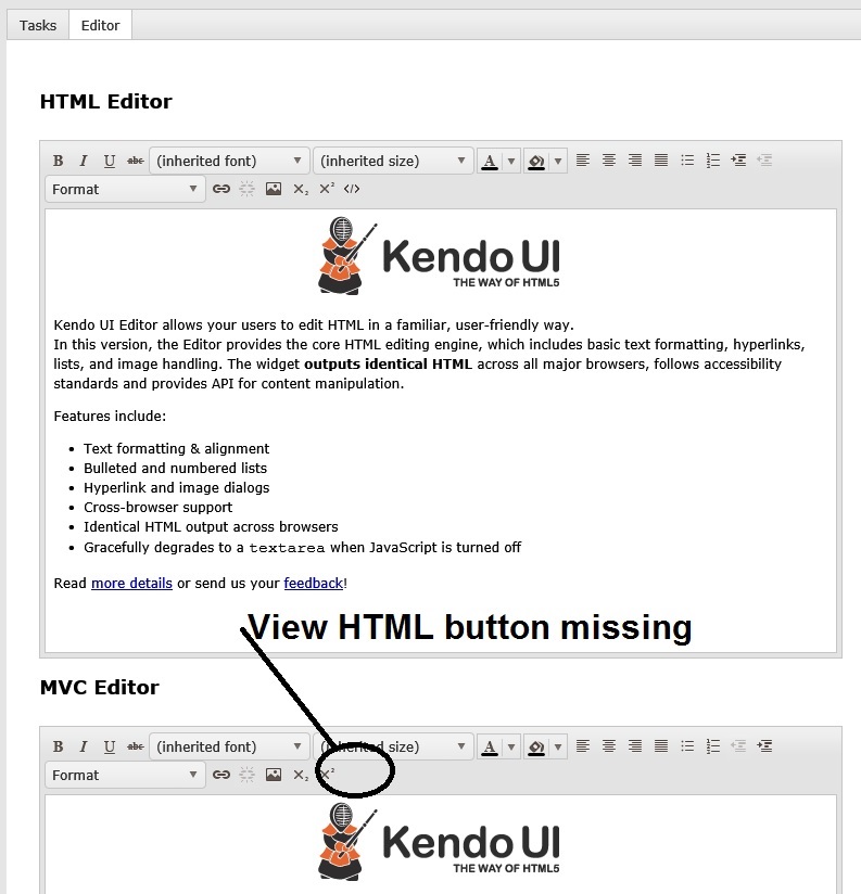 In the attached screen print I added the HTML version 2012.2 913 of editor and MVC version code snippet from the view all http://demos.kendoui.com/web/editor/all-tools.html. The HTML version has the (View HTML) the MVC version does not have this button. I also tried the latest internal build 2012.2.1029 this did not have the feature. In the Razor file when I add .Tools(tools => tools . viewHtml is not listed as a tool.