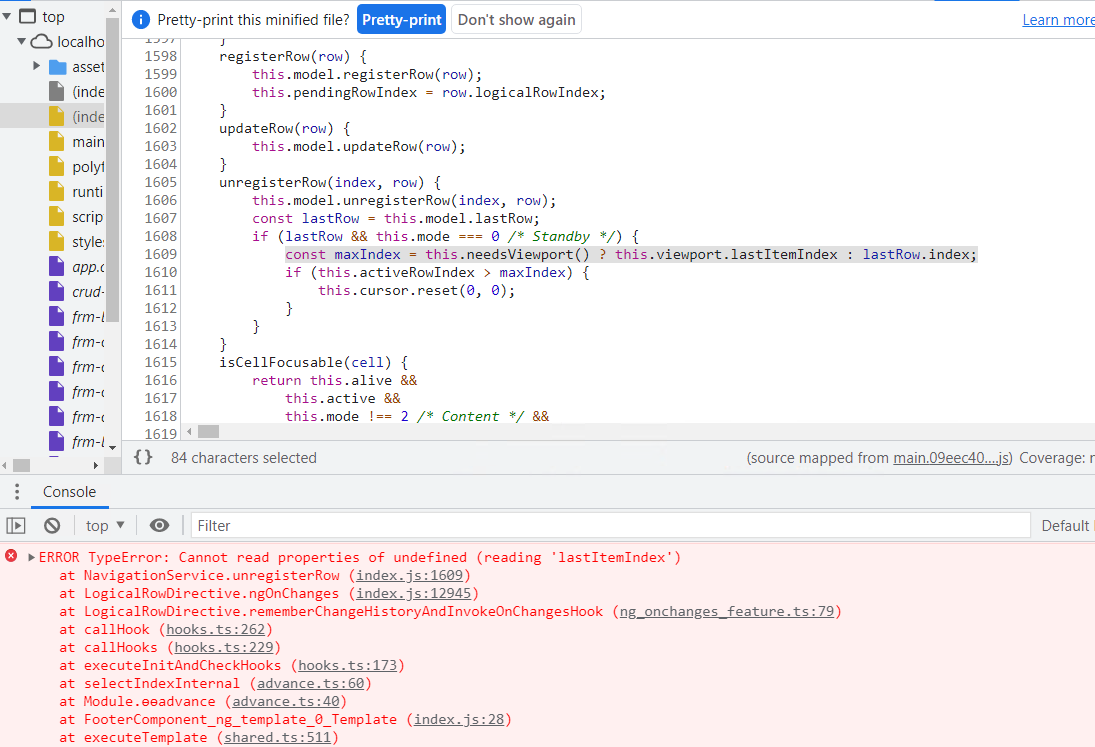 I guess that is happening because they are still no rows in the grid (they load with the API response) and it accesses the unregisterRow method for some reason.