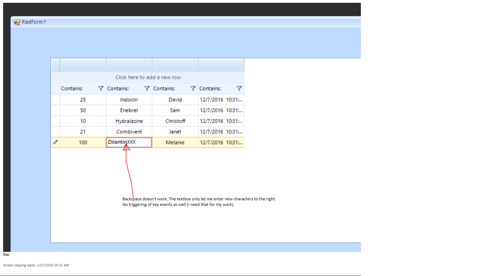 What happens now is, when I click on the cell, the cell becomes editable, and I can type in it, but I cannot backspace on the cell to delete the characters entered. In addition to that I don't even get the CellValidating event. Besides, the KeyUp event on editor's element (RadTextBoxControlElement) is also not fired.