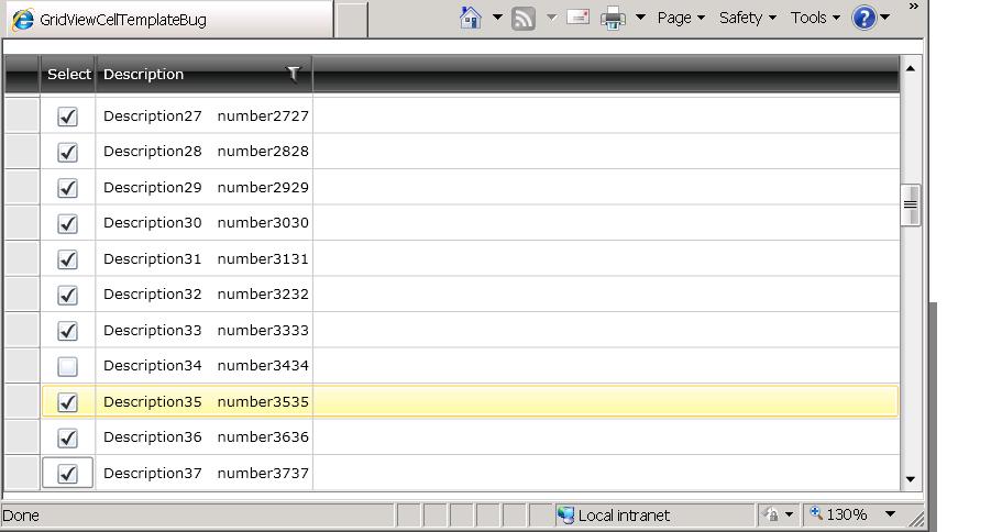 <UserControl x:Class="GridViewCellTemplateBug.MainPage" xmlns:telerik="http://schemas.telerik.com/2008/xaml/presentation" mc:Ignorable="d" d:DesignHeight="300" d:DesignWidth="400"> <Grid x:Name="LayoutRoot" Background="White"> <telerik:RadGridView x:Name="rgvProducts" Grid.Row="1" Margin="0,10,0,5" CanUserFreezeColumns="False" GridLinesVisibility="Both" HorizontalAlignment="Stretch" VerticalAlignment="Stretch" FontSize="10" FontWeight="Normal" Height="Auto" ShowGroupPanel="False" IsFilteringAllowed="True" AutoGenerateColumns="False" IsReadOnly="False" CanUserSelect="False"> <telerik:RadGridView.Columns> <telerik:GridViewDataColumn Header="Select" > <telerik:GridViewDataColumn.CellTemplate> <DataTemplate> <CheckBox IsChecked="{Binding Selected}" IsEnabled="True" HorizontalAlignment="Center" /> </DataTemplate> </telerik:GridViewDataColumn.CellTemplate> </telerik:GridViewDataColumn> <telerik:GridViewDataColumn Header="Description" UniqueName="SKUDescription" IsReadOnly="True" /> </telerik:RadGridView.Columns> </telerik:RadGridView> </Grid> </UserControl> Code: