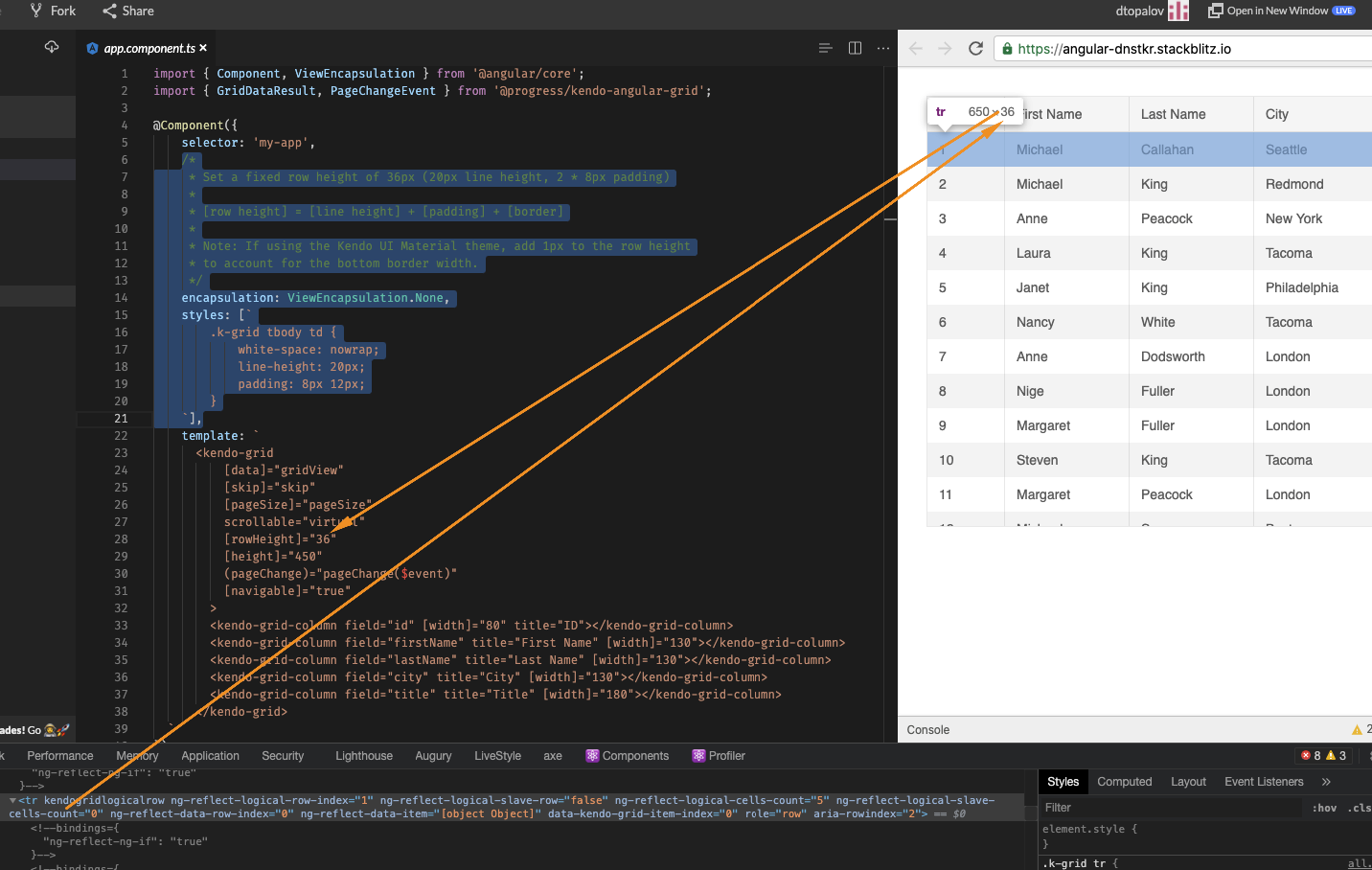 (Required) rowHeight—Has to represent the actual height of each Grid row (tr) element in the DOM. The provided rowHeight number is used for internal calculations and does not set the row height of the Grid.