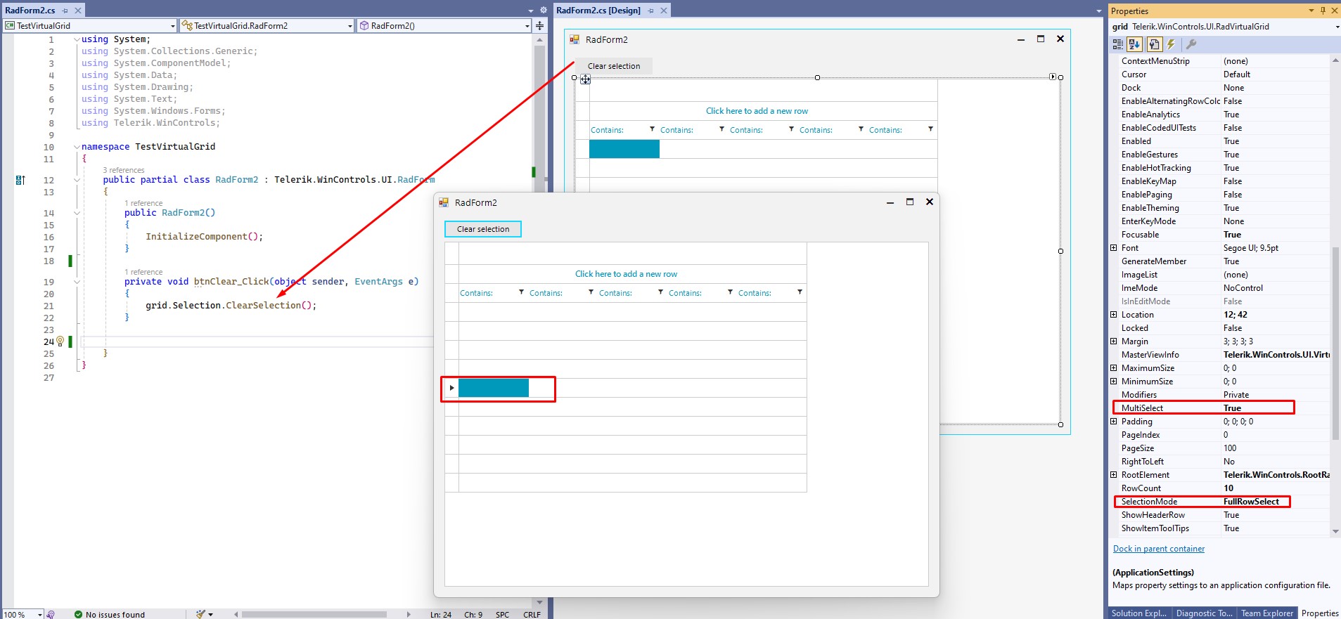 I have a simple VirtualGrid with SelectionMode=FullRowSelect and MultiSelect=true. When I use the ClearSelection method the arrow in the row header is still visible and also the last clicked cell (see the attached video in the zip file).