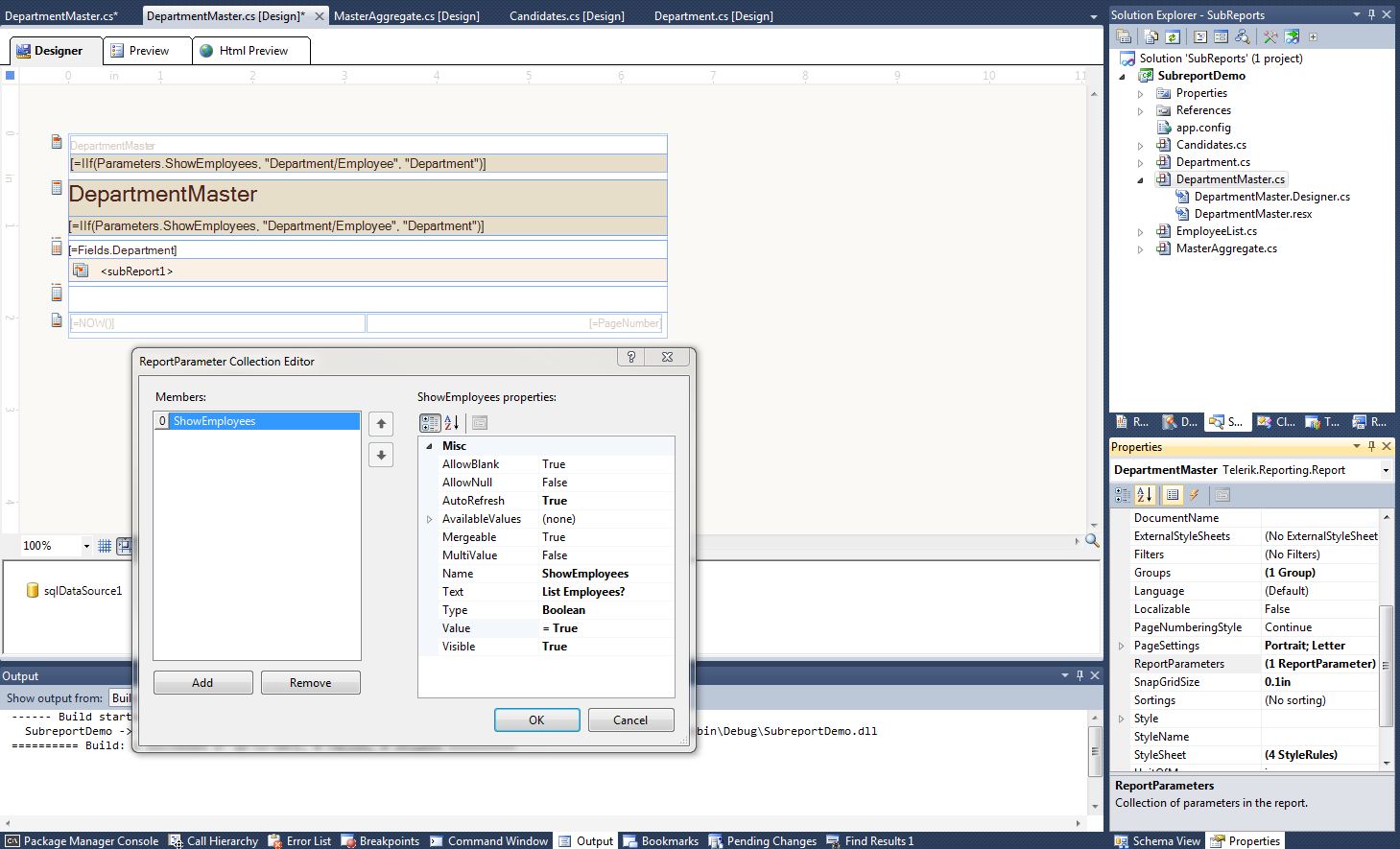 private void subReport1_ItemDataBinding(object sender, EventArgs e) { Telerik.Reporting.Processing.SubReport sr = sender as Telerik.Reporting.Processing.SubReport; sr.Visible = (bool)(sr.Report.Parameters["ShowParameter"].Value); }The same can be achieved by binding the subReport item Visible property to the report parameter value. Both approaches are illustrated in the attached sample project.