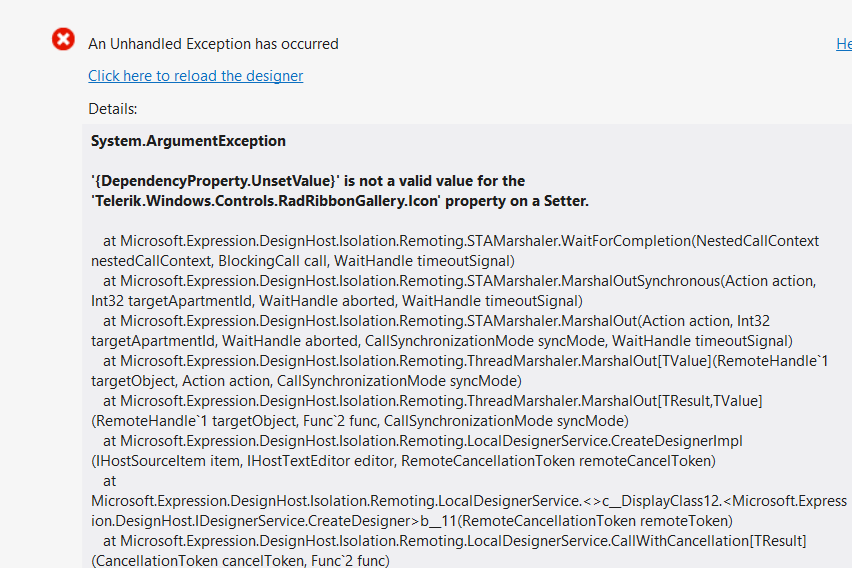 '{DependencyProperty.UnsetValue}' is not a valid value for the 'Telerik.Windows.Controls.RadRibbonGallery.Icon' property on a Setter.