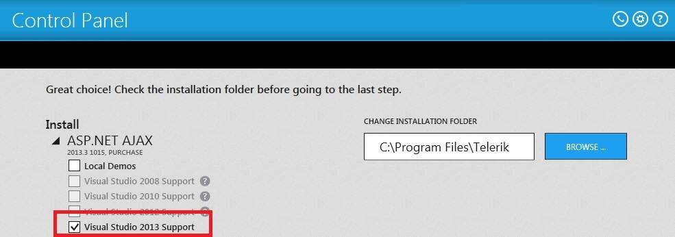 If the Visual Studio 2013 Support check box is not selected, check it and proceed with installation.