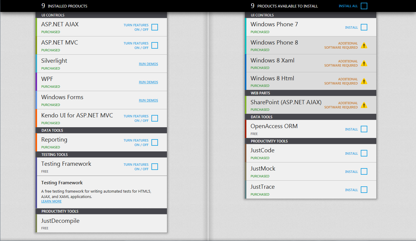 I have DevCraft Complete. I have the Telerik menu etc. in VS 2012. I just updated DevCraft yesterday and noticed that it installed extensions for VS2010 and VS2012, but not VS2013