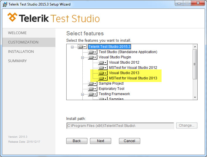 I am trying to create my first testing in Visual Studios 2013 with the Test Studio plugin. I am following the instrustions below. For some reason Telerik is not showing up as an installed template, when trying to select a project type. VS 2013 was installed before Test Studio. I have unistalled and re-installed Test Studio, but no luck.