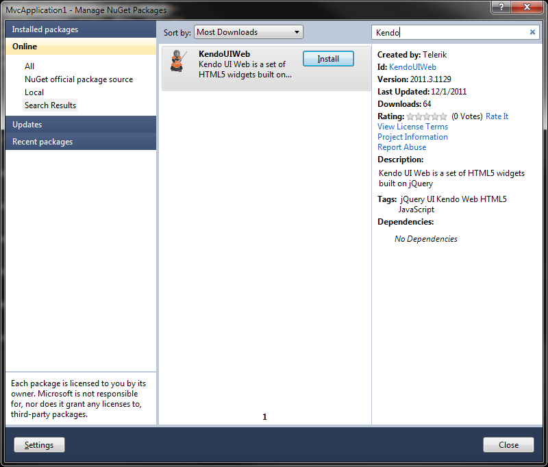 on my machine. I searched for Kendo - and the KendoUIWeb - nuget appeared in search results and I installed.