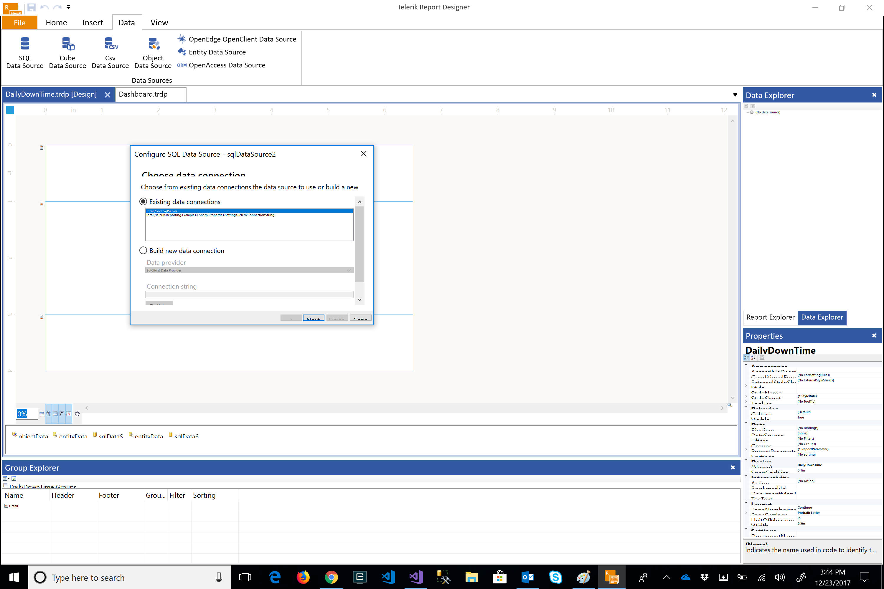 The Telerik Reporting Menu lets you run the Report Explorer, Data Explorer, Group Explorer and Upgrade Wizard. It is accessible through the Telerik Menu --> Reporting. The above tool windows are only visible in the report designer context. You have to click within the report designer to enable them.