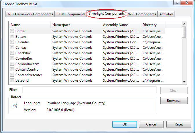 If you could check my last post i have mentioned that, the problem of adding the controls to the VS Toolbox is solved by adding it in the "Silverlight component" tab. Exactly as you mentioned. But my other problem is I am not able to view the controls in the preview pane. The error message is mentioned in my previous post.