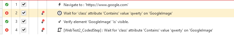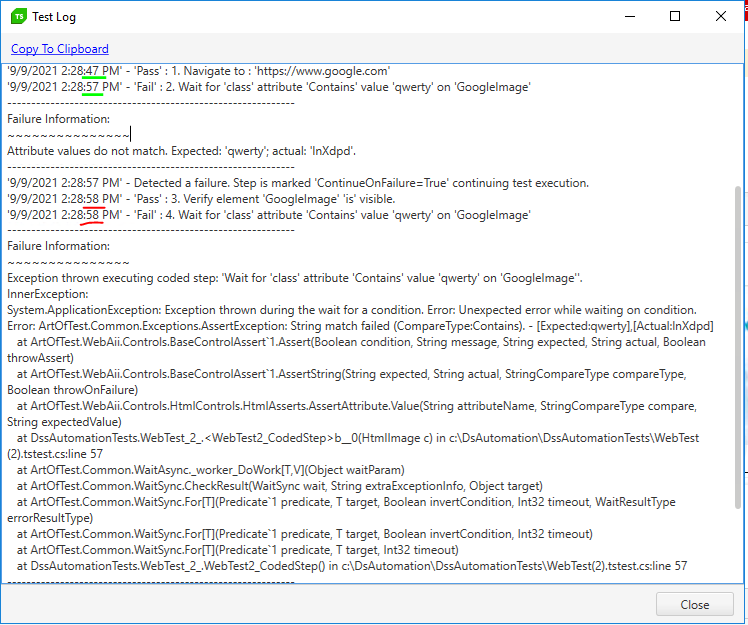 In 2nd step, the test waits for condition 10 seconds and fails as expected. In 4th step, the test fails immediately with "Error: Unexpected error while waiting on condition" (see Picture2). I need to use waitings like this in coded steps.
