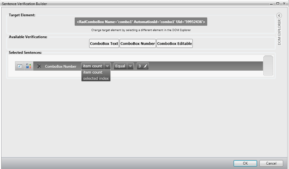 I don't get "item count" as an available verification for the combobox. Actually, the sentence for the combobox is not editable - it shows only "selected item is -1", and I can not change this. Refer attached screenshot (which works now).