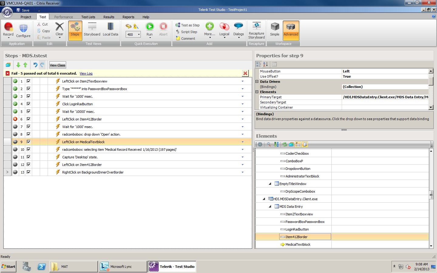 I am recording a tesp step in a WPF application using Telerik Test Studio ver. 2012.2.920.0. The test step where it is failing is when I try to