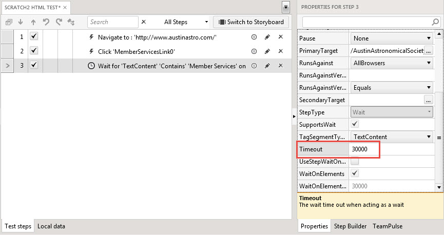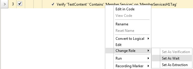 To change your Verify into a Wait For, right click on the test step and select Change Role -> Set As Wait. Once done you can then control the waits timeout in the Properties pane. See the two attached screen shots.